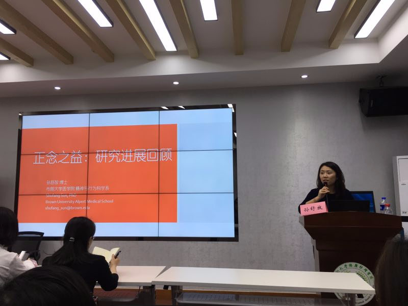 本次讲座主讲人为布朗大学医学院博士后,临床心理学家孙舒放博士。孙博士从威斯康星-麦迪逊大学获得咨询心理学博士学位,并在包括威斯康星大学、埃默里大学医学院、布朗大学医学院等多所大学中开展以正念为基础的干预性研究并教授正念疗法。在她的研究中,其干预人群包括了大学生、HIV感染者、复健期病人以及精神科病人等。