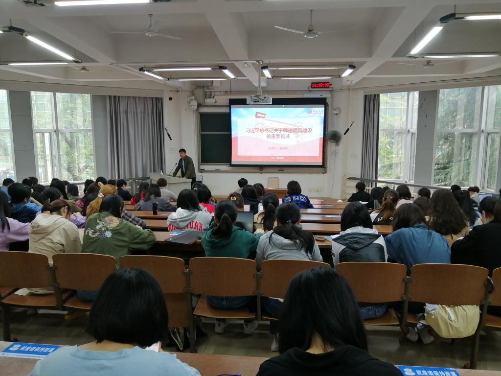 袁世平首先带领大家从“教师的重要地位和作用、教师师德师风的基本内涵、当代教师的根本任务和使命”三个方面学习了“习近平总书记有关师德师风建设的重要论述”有关内容。袁世平在报告中强调,百年大计,教育为本;教育大计、教师为本。在新时代,教师是落实立德树人根本任务的责任主体和实施主体,肩负着培养中国特色社会主义合格建设者和接班人的根本任务,因而抓好师德师风建设是确保教师“为谁培养人”的前提和基础,是打造高素质教师队伍的内在要求和重要保证,更是保证教师自觉践行立德树人根本任务的关键。