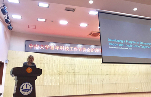 2017年10月26日晚,Whittemore教授于参加开元集团官网入口青年科技工作者协会护理学分会学术论坛,并做《Developing a Program of Research ‘Happy and Tough Come Together’》的学术报告,Whittemore教授介绍了她是如何由一名外科护士,决定继续回到学校深造,并从事糖尿病教育与照护研究的心路历程,她分享在攻读博士阶段、博士后阶段以及后续在耶鲁大学工作后,进行系列科研的体会,为我院师生展现了她构建自己的护理科研事业的完整画面,激励更多的护理人员继续深造,获得博士学位,成为引领护理学科发展的一份子。Whittemore教授的讲座给了与会的年轻护理科研人员很多思考,包括对护理科学研究意义的全新认识,与会的临床护理工作者纷纷表示是时候继续攻读护理学博士学位了,这对推动我院学科建设具有重要意义。