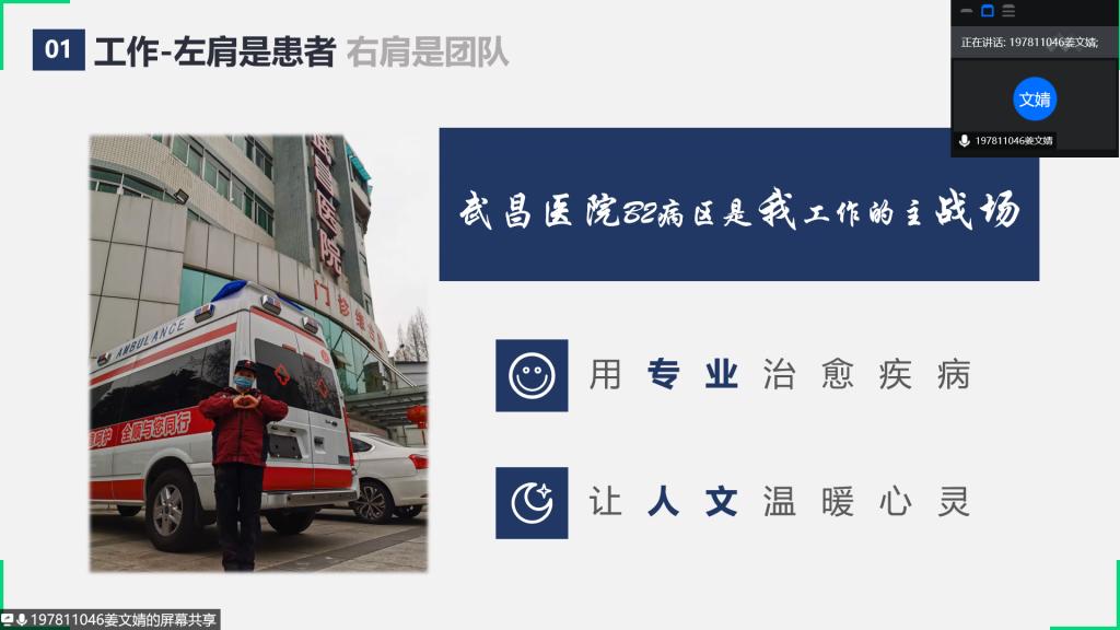 首先,驰援湖北一线的姜文婧同学分享了自己的亲身经历。她说,在接到医院上级的通知后,没来得及和学校、家人解释,与医院的护理团队立马奔赴湖北武昌医院。在此期间,所有护理人员一直秉持“用专业治愈疾病,让人文温暖心灵”的理念对待每一位患者,同时化身“话疗师“和“理发师”倾听患者的心声、为患者理发,给予他们疏导、安慰和力所能及的支持。姜文婧总结说,虽然前线的生活艰辛困苦,但却遇到很多温暖的人和事,有为他们写感谢信的患者,有为接送他们的公交车司机,还有为他们提供24小时在线服务的宾馆工作人员这一切让大家也深刻体会到了在疫情面前武汉人民、全中国人民在中国共产党领导下血肉相连、齐心协力共克时艰的民族精神。