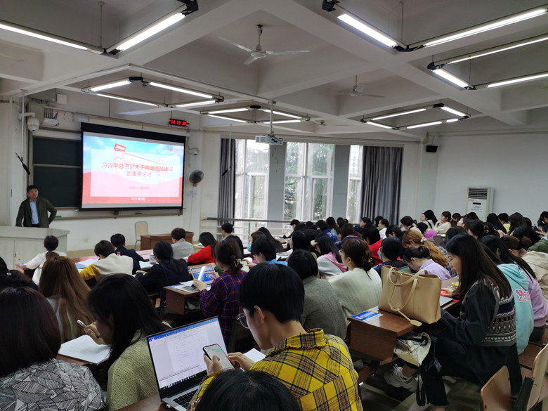 最后,袁世平重点就习近平总书记有关师德师风建设的重要论述与大家一起分享了个人的学习体会。他从教师的重要地位和作用、教师师德师风的基本内涵、师德师风建设的时代要求、师德师风建设的实践路径等方面对总书记的重要论述进行了解读。他强调要求,全体教职员工应高度重视,大力加强师德师风建设,牢固树立共产主义远大理想信念和中国特色社会主义共同理想,不断增强“四个意识”,坚定”四个自信”,做到“两个维护”;牢固树立终身学习理念,牢固树立改革创新意识,牢固树立学生中心意识;坚定厚植爱国情怀,弘扬高尚师德,潜心立德树人,以赤诚之心,奉献之心,投身教育事业,为党育人,为国育才,积极努力做一名新时代“四有”好老师。