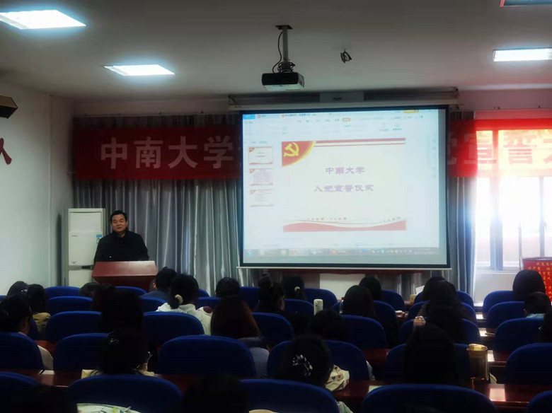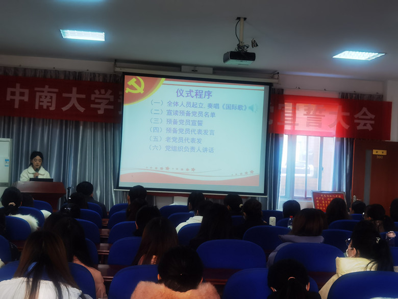 全体人员奏唱《国际歌》后,刘新娥宣读了此次参加宣誓的预备党员名单,并代表党委对新党员的加入表示祝贺和欢迎。研究生第一党支部书记苏义冬带领参加宣誓的59位预备党员高举右臂,紧握右拳,面对鲜红的党旗庄严宣誓。他们用高昂、奋进的声音传递着党员决心和担当;用坚定、无悔的眼神彰显着党员忠诚与执着;用挺拔、坚强的身躯表达着党员的无悔与坚守。短短八十字的誓词是他们入党后对党的第一个承诺。