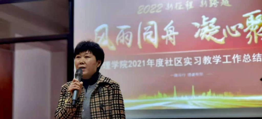 李映兰总结了一年来社区实习基地的实习管理工作及实习生的表现,表达了对实习基地领导及带教老师的感激之情。她指出,2021年我院本科生和硕士研究生分布在7个社区基地进行实习,基地老师们从学生管理、教学指导以及服务社区人群等诸多方面作了大量工作。并表示我院将积极推进实习教学改革,切实加强实习基地建设力度,以强化实习过程管理和检查为抓手,使学院与各实习基地、所有实习生一起形成了实践育人合力,以进一步提升人才培养质量。