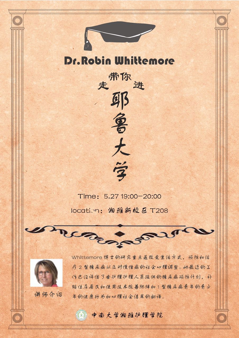 Robin Whittemore教授,现任耶鲁大学护理学院博士研究生项目主任,致力于糖尿病预防和治疗的生活方式干预以及改善慢性疾病的心理社会学适应结局研究。近五年来以第一作者发表SCI论文25篇,获得科研经费170万美元,其中主持新英格兰NIH基金1项,美...