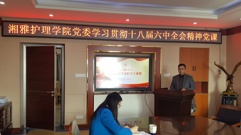 12月9日中午,我院教职工党员在学院637会议室召开党员会议,学习贯彻十八届六中全会精神。学院党委书记罗军飞同志主讲党课,全体教职工党员参加学习。