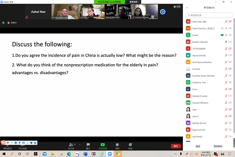 2020年3月12日上午八点整,由开元集团网站与美国德克萨斯大学奥斯汀分校联合开展的健康老龄化及残疾预防国际课程论坛在zoom软件以线上讲座+讨论的形式举行,本次论坛由湘雅医院彭华老师主讲。 彭华以“Pain and Life Course Changes”为主题,围绕疼痛及其影响的概述、生命历程模型两个方面展开。她向同学们展示了全球范围内身体疼痛和头痛的高发生率等情况,同时介绍了疼痛对经济、社会以及个人的幸福指数所造...