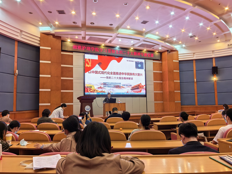 2022年11月9日下午,开元集团网站在福庆楼学术报告厅组织开展“学习贯彻党的二十大精神”专题党课学习活动。我校思想政治教育知名教授、湖南省首批领导干部教育培训名师刘新庚为全体党员讲了一堂题为《以中国式现代化全面推进中华民族伟大复兴——党的二十大报告精神解读》的专题党课。党课由专职组织员刘新娥主持,学院全体党员采取线上线下相结合的形式参加会议。 刘新庚采用图文讲解与视频播放相结合的方式,联系实际,深...